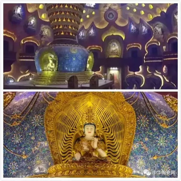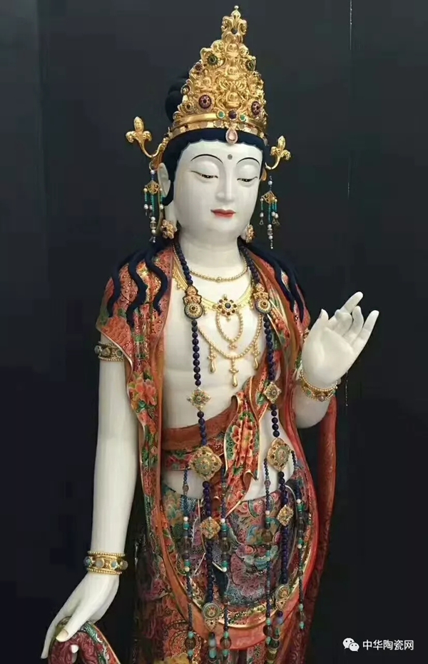 燒制完成之后,還要由莆田工藝大師吳立波進行彩繪和鑲嵌,包括表面巖彩金線鑲嵌,瓔珞、蓮臺、背光局部巖彩鑲嵌等。