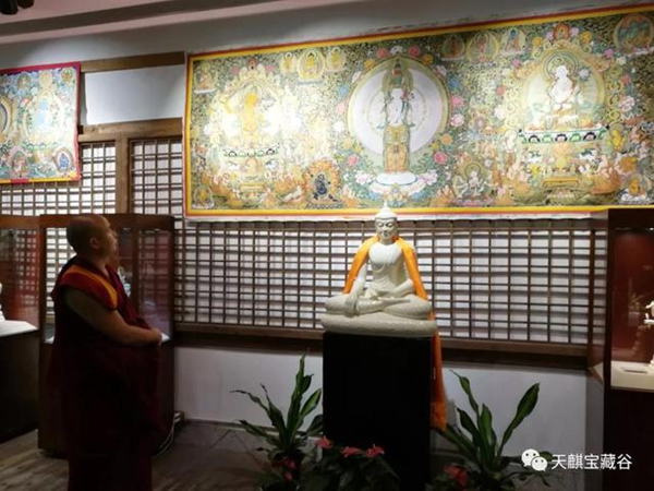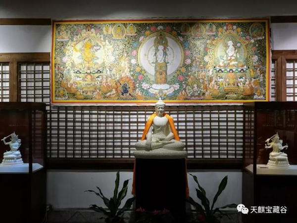 這次展出的作品有“寶藏谷”藏傳佛瓷造像、勉唐畫派唐卡作品。“寶藏谷”藏傳瓷質(zhì)造像是依據(jù)藏傳佛教《造像度量經(jīng)》的儀軌進(jìn)行嚴(yán)格演算和雕塑,經(jīng)過火的燒制,顯得細(xì)膩精美,溫潤通透,呈現(xiàn)出莊嚴(yán)、肅穆的藝術(shù)效果。