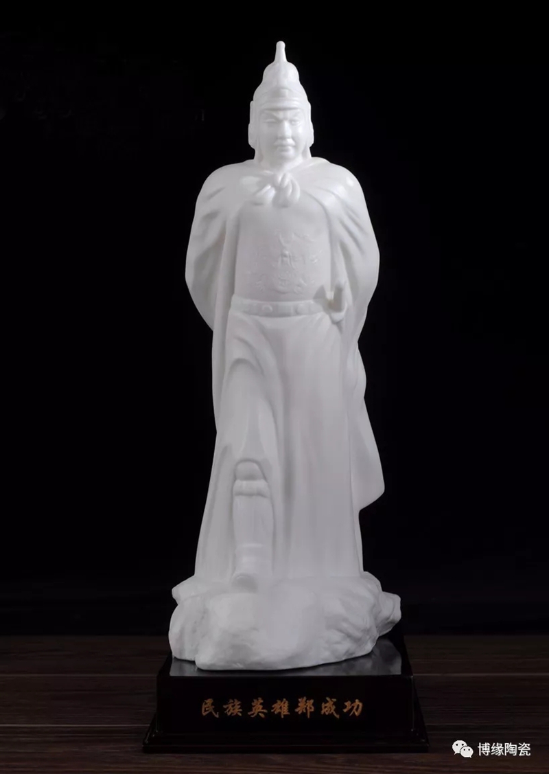 《民族英雄鄭成功》——作品以聞名世界的德化白瓷為胎質(zhì),由工藝美術(shù)大師制作,精選優(yōu)質(zhì)高嶺土,經(jīng)70多道工序手工制作而成,作品經(jīng)過(guò)1300多度高溫?zé)疲少|(zhì)溫潤(rùn)、細(xì)膩、人物精雕細(xì)刻,所塑鄭成功神形兼?zhèn),氣?shì)磅礴,再現(xiàn)了當(dāng)年鄭成功揮師東渡,驅(qū)荷復(fù)臺(tái)的歷史場(chǎng)面。作品全高39cm。