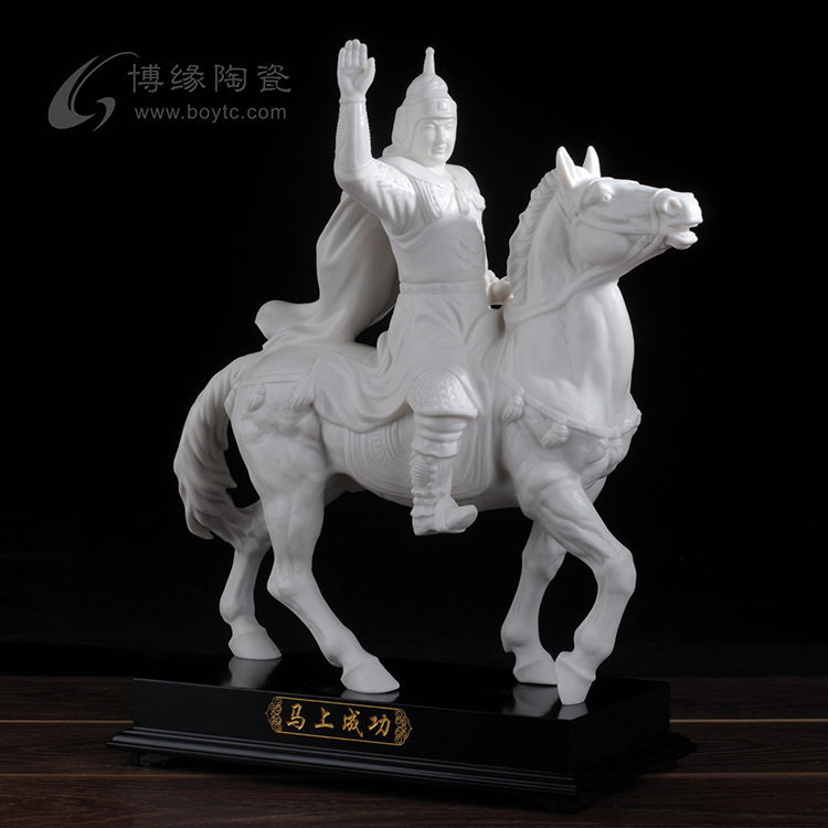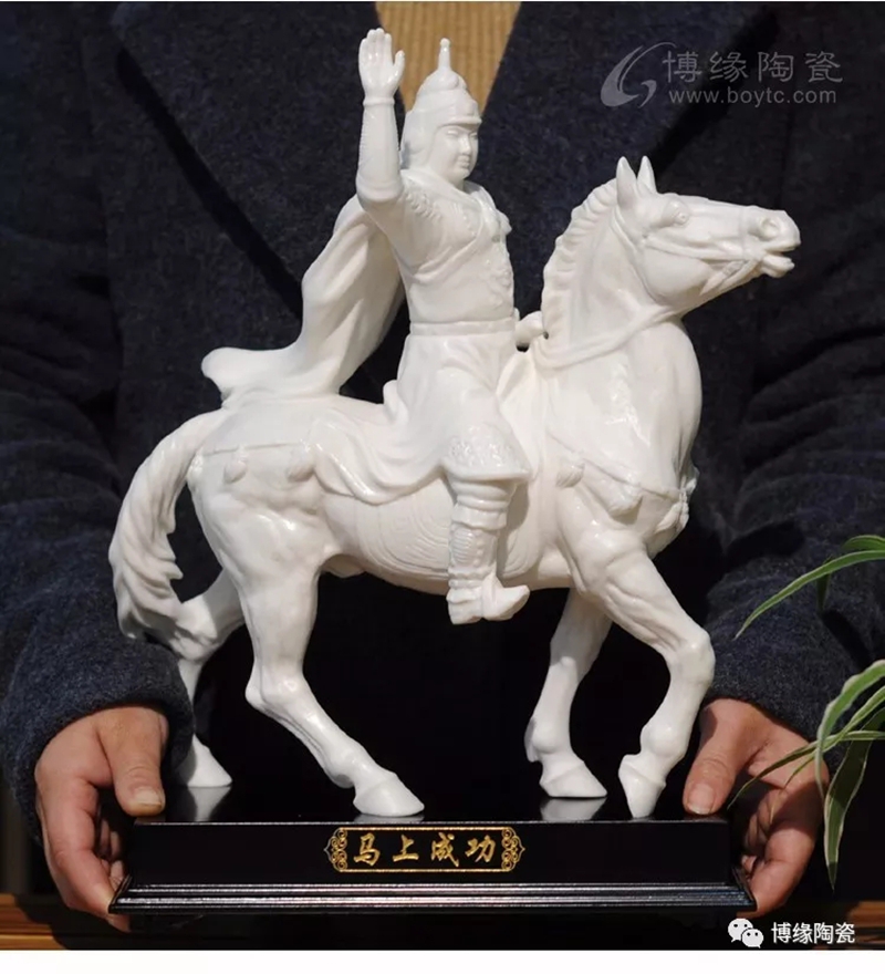 《馬上成功》作品由德化工藝美術(shù)大師制作,以德化特有溫潤(rùn)如玉的“中國(guó)白”為胎質(zhì),手工制作,所塑人物威風(fēng)凜凜,英姿颯爽,形神兼?zhèn);所塑駿馬健碩勇猛,栩栩如生,尤如馬蹄聲陣陣,銀蛇騰空去,烈馬飛奔來(lái)。