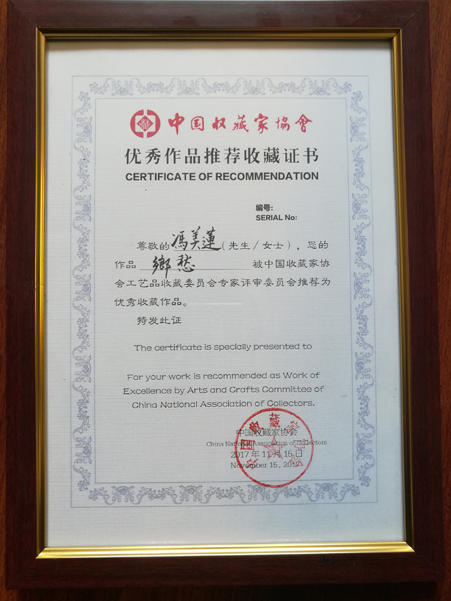 作品《鄉(xiāng)愁》中國收藏家協(xié)會(huì)工藝品收藏委員會(huì)評(píng)審為優(yōu)秀作品