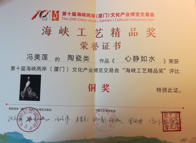作品《心靜如水》在“海峽工藝精品獎(jiǎng)”評(píng)獎(jiǎng)中榮獲銅獎(jiǎng)