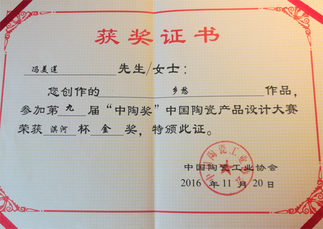 2016年《鄉(xiāng)愁》獲中國陶瓷工業(yè)協(xié)會(huì)主辦的第九屆“中陶杯”中國陶瓷產(chǎn)品設(shè)計(jì)大賽“淇河”杯金獎(jiǎng)、第九屆海峽兩岸(廈門)文化產(chǎn)業(yè)博覽交易會(huì)“中華工藝精品獎(jiǎng)”金獎(jiǎng)。