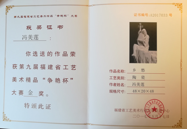 2017年《鄉(xiāng)愁》獲得第九屆福建省工藝美術(shù)精品 "爭艷杯"金獎(jiǎng)
