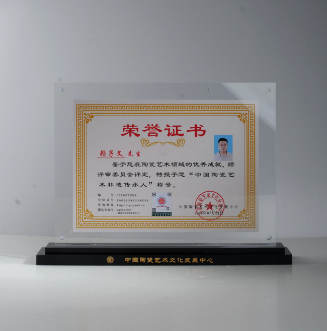 賴子文,1985年出生于“中國(guó)瓷都德化”,陶瓷世家,從小深受瓷都德化陶瓷文化熏陶 ,酷愛(ài)陶瓷創(chuàng)作,大學(xué)畢業(yè)后回瓷都德化從事陶瓷開(kāi)發(fā)工作,先后進(jìn)入佳美集團(tuán)等從事陶瓷設(shè)計(jì)工作,經(jīng)過(guò)多年的學(xué)習(xí)積累,熟練掌握陶瓷設(shè)計(jì)、制作、瓷土配方、拉坯、燒制、釉藝等技藝,2024年成立福建省德化縣匯瓷窯陶瓷有限公司并任藝術(shù)總監(jiān)。賴子文從事陶瓷設(shè)計(jì)創(chuàng)作10多年,主要作品有羊脂玉、冰種玉瓷茶具、手繪茶具、手拉坯等各種茶器。作品多次獲得國(guó)內(nèi)各評(píng)比大賽金獎(jiǎng),其作品深受廣大客商、藏家青睞,廣受好評(píng)。