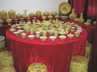 | 這套皇宮用瓷是按照清朝同治皇帝結(jié)婚時定制的全套皇宮用瓷,由景德鎮(zhèn)藝術(shù)瓷廠仿制,當(dāng)時共制作了兩套,一套被泰國皇室(陸軍司令)重金購去,目前國內(nèi)僅此一套。 為了仿制這套皇宮用瓷,景德鎮(zhèn)藝術(shù)瓷廠曾派數(shù)批技術(shù)人員專門到故宮查資料定品種、定規(guī)格、定瓷用顏料、定材質(zhì)等,先后三個多月 ,回廠后,由3000多名藝術(shù)和科技人員經(jīng)過三年多時間的共同努力,終于仿制成功